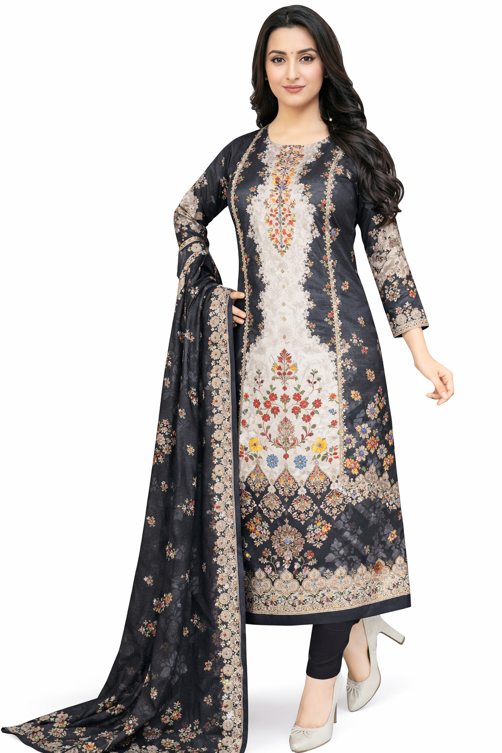 হাতের কাজ করা কারচুপি কুর্তি, ম্যাচিং প্যান্ট এবং ওড়না সহ আনস্টিচ থ্রি-পিস। নিজের মাপ অনুযায়ী সেলাই করার জন্য পারফেক্ট। নরম কটন ফেব্রিক গরমে আরামদায়ক।